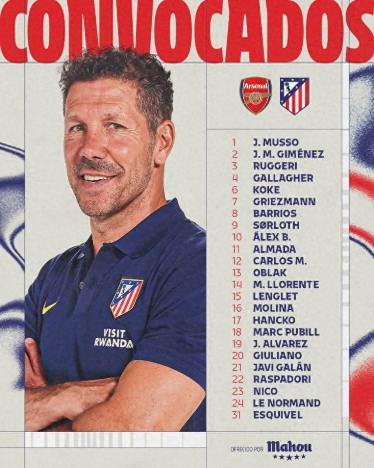 马竞客战阿森纳名单:阿尔瓦雷斯、格列兹曼领衔,卡尔多索缺席